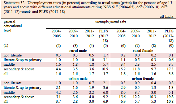The metric change between the PLFS 2017-18 and the earlier Employment and Unemployment Situation Report is the reason behind the incomparability of the data sets. The new metric the unemployment rate have been calculated by giving more weightage to literate unemployed population. The earlier reports did not give much weightage to literate unemployed rather calculated it on a general basis. The unemployment rate among educated people in the rural and urban areas have increased since the last years as the data below suggests.